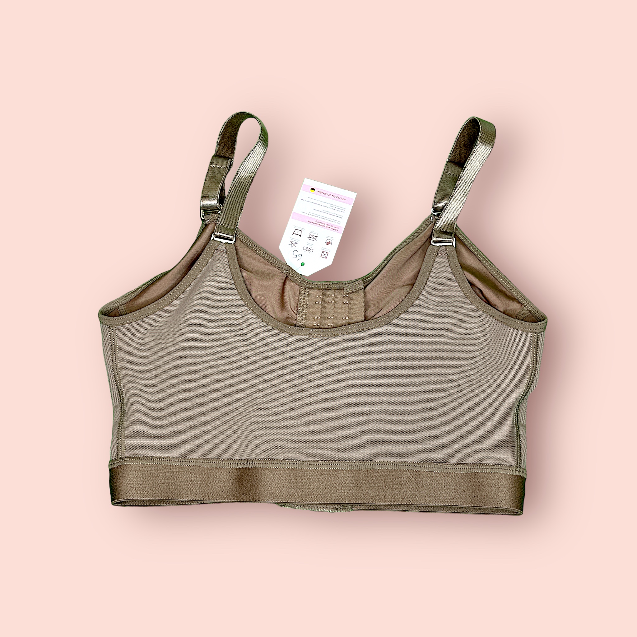 Nuestro sostén deportivo en color bronce está confeccionado con un tejido suave y transpirable que proporciona una sensación de frescura y comodidad durante todo el día. El diseño incluye un cierre frontal que facilita su uso y ajuste, permitiéndote ponértelo y quitártelo con facilidad. El color bronce añade un toque de elegancia y sofisticación a tu guardarropa deportivo.